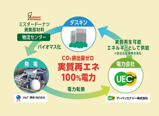 ダスキンでは、2021年に「ダスキン環境目標2030(DUSKIN Green Target 2030)」を策定し、脱炭素社会の実現に向けて、2030年度までに再生可能エネルギー利用比率50%とグループ拠点CO2排出量を2013年度比46%削減することを目標に掲げています。この目標を達成するため、J&T環境株式会社の食品リサイクル工場や、その子会社である株式会社Jバイオフードリサイクルの施設などで食品残渣から微生物の働き(メタン発酵)によって発生するバイオガス発電をアーバンエナジー経由で購入し当該施設で使用します。この食品残渣の一部には、ミスタードーナツの北海道・東北・関東・東海地域の4地域の物流センターで保管されている原材料のうち、期限切れ等でどうしても出てしまう食品残渣を利用します。ミスタードーナツの食品ロス対策については、1993年より再資源化を実施しており、今回は4地域の物流センターで排出される食品残渣を発電させるためのエネルギーとして再生利用します。