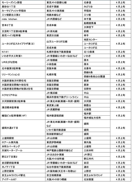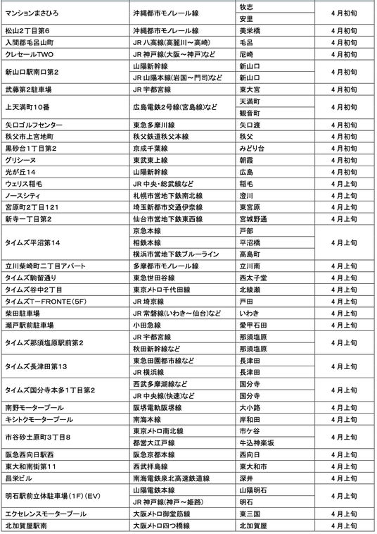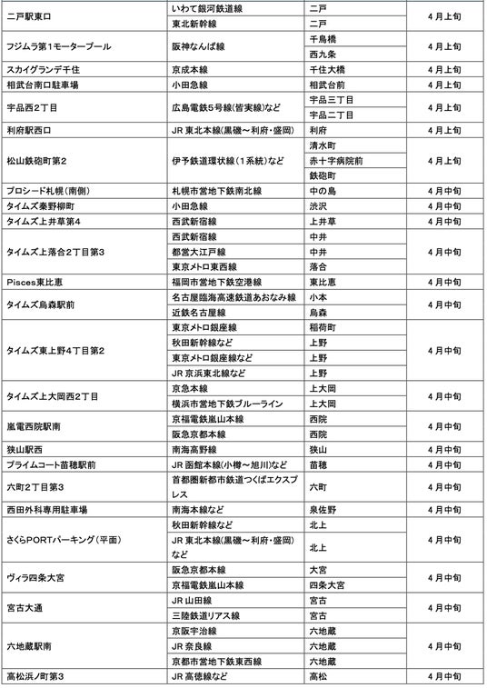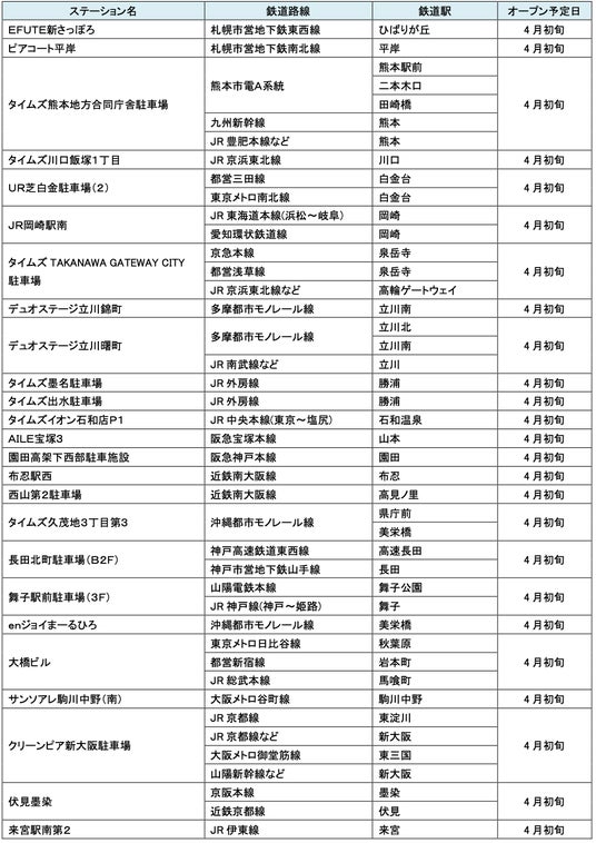 パーク24株式会社(本社:東京都品川区、社長:西川光一)は、温室効果ガスの排出量削減に繋がる移動法「パーク&ライド」および「レール&カーシェア」が可能なタイムズパーキングおよびタイムズカーステーションの2025年4月におけるオープン予定をお知らせいたします。