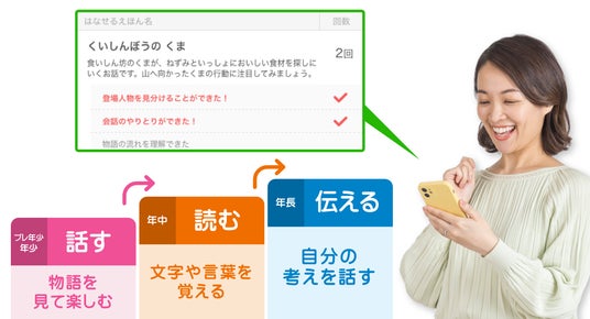 絵本には、学齢に応じて段階的に成長できるよう、表現力や共感力などさまざまな学習テーマが設定されています。2歳からのプレ年少・年少講座では、物語を見て楽しむことで、話す力が育まれます。年中講座では、文字や言葉を覚えることで、読む力が養われます。年長講座では、自分の考えを話すことで伝える力が向上します。「はなせるえほん」を通して、小学校からの学習に必要な「話す・読む・伝える」といった基礎的な能力が身につけられます。保護者は、お子さまの学習結果を確認する「みまもるネット」から、どのテーマが身についたのか、把握することができます。