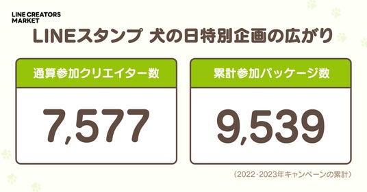 さらに、LINEスタンプが実施する犬の日特別企画には多くのクリエイターが賛同し、開始からの2年間で参加クリエイター数はのべ7,677名、犬の日特別企画の参加パッケージ数は累計9,539にものぼります。
