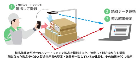 今回のプロジェクトでは、「Future EdgeAI」を搭載したスマートフォンとPCを連携させて完成品の数をチェックする仕組みを導入しました。梱包した製品を載せたパレットを指定位置に配置し、担当者がパレット側面をスマートフォンで撮影すると上面に設置したスマートフォンが連動して撮影を行います。「Future EdgeAI」が自動で製造指示書と製品ラベルを読み取り、予定通りに製造が行われたかどうかのチェック結果はPCに表示されます。目視での作業がなくなることで月間23時間の業務削減を図り、かつ、委託製造業務の品質向上にも寄与します。