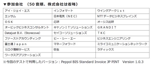 本テストは、下記のEIPA会員有志25社が参加し、各社が提供するデジタルインボイス(Peppol e-invoice)対応製品サービスとの間で実施いたしました。これにより、それぞれのお客様の環境において、異なるシステム間での送受信ができることが実証されました。