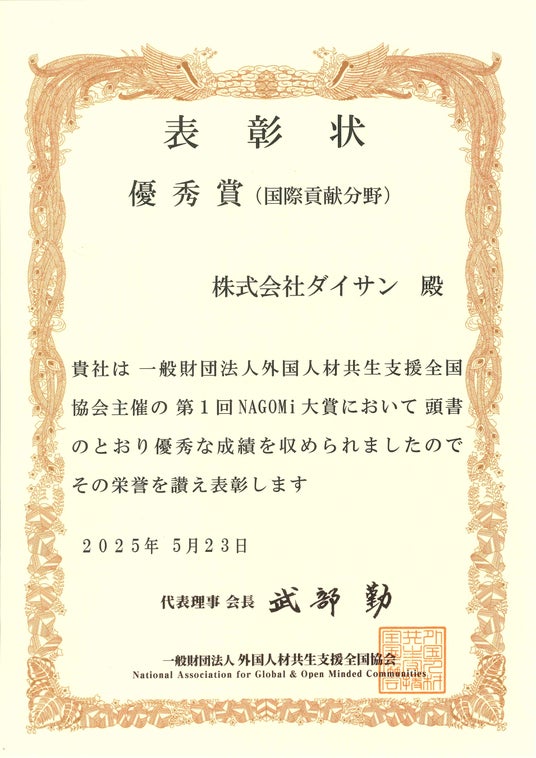 一般財団法人外国人材共生支援全国協会主催「第17回NAGOMiフォーラム in 大阪」において、同協会が新設した「第1回NAGOMi大賞」の表彰式が執り行われました。株式会社ダイサン(代表取締役社長:藤田武敏) は、その国際貢献分野において「優秀賞」を受賞いたしました。