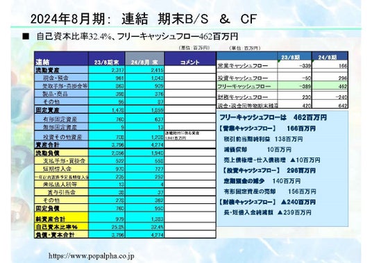 当社は、黒字化を達成したことにより、自己資本比率が32.4%まで回復し、財務基盤の安定化が進んでおります。営業キャッシュフローはプラス1億6千6百万円、投資キャッシュフローはプラス2億9千6百万円となり、結果としてフリーキャッシュフローはプラス4億6千2万円を達成しました。また、期末時点での現金および現金同等物の残高は6億4千2百万円となり、十分な流動性を確保しております。