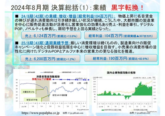 2024年8月期通期決算を2024年10月11日に発表しました。売上高は61億2千4百万円、経常利益は1億4百万円となり、前期の▲307百万の赤字から黒字転換を果たしました。この結果は、経営の立て直しに向けた取り組みが功を奏したことを示しています。引き続き、収益基盤の強化に努め、企業価値の向上を目指してまいります。