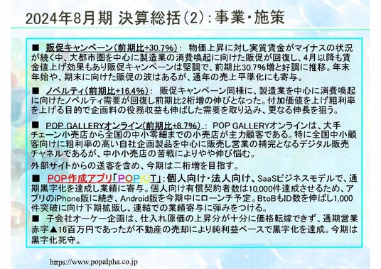 POP GALLERYオンラインは、前期比で8.7%の成長を見せました。小売店への販促予算は依然厳しいものの、自社企画製品の高い粗利率を活かし、ヤフーや楽天などの大手ポータルサイトと提携しさらなる集客を図ります。