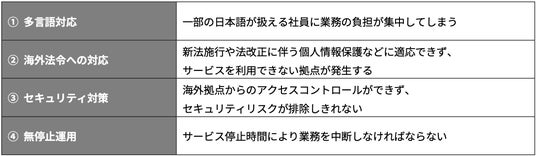 海外への進出にあたり、国内本社と海外拠点をつなぐ環境の整備は必要不可欠です。 多言語対応はもちろん、時差を考慮したシステム運用、GDPRなど各国の法規制への対応やグローバル基準の強固なセキュリティ対策はすべての日本企業に共通する経営課題といえます。