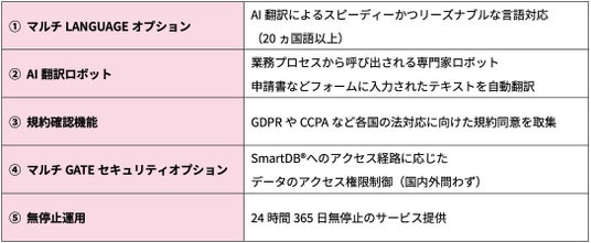 前述の経営課題に対して、ドリーム・アーツは日本企業のグローバル市場での競争力強化・持続的な成長を支えるために、SmartDB(R)を主軸とした海外DXの支援ソリューションを展開していきます。 具体的にはAI翻訳ロボットや現地の法対応、各拠点のアクセスコントロールなど、特定のエリアに限らず事業戦略において重要となる国や地域でのサービス活用を前提に、日本で整備された業務オペレーションの海外への展開を支援してまいります。