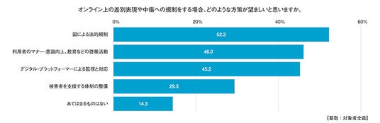 また、規制をする場合の望ましい方策としては、「国による法的規制(52.3%)」や「利用者のマナー・意識向上、教育などの啓蒙活動(46.0%)」、「デジタル・プラットフォーマーによる監視と対応(45.2%)」が求められている。