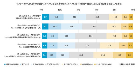 インターネット上の誤った情報・ニュースの存在が、回答者の意識や行動にどのような影響を与えているかについて聞いたところ、約半数の人が「ストレスや不安を感じるようになった(48.3%)」と回答。また、「ニュースに対する関心が全体的に低下した(44.4%)」のほか、「ニュースに関する話題の議論を避けるようになった(36.8%)」、「ニュースを読む頻度が減少した(36.3%)」といった行動への影響も明らかになった。