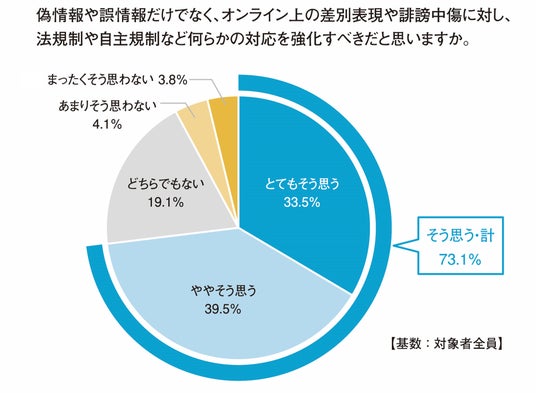 「オンライン上の差別表現や誹謗中傷を見かける」人の割合を見ると、「頻繁に見かける」「たまに見かける」の合計は73.2%で、多くの人が目にしている現状が明らかになった。そうした現状の下、何らかの対応を強化すべきかどうかについては、「とてもそう思う」「ややそう思う」の合計で73.1%と、対応の強化を求める人が多い。