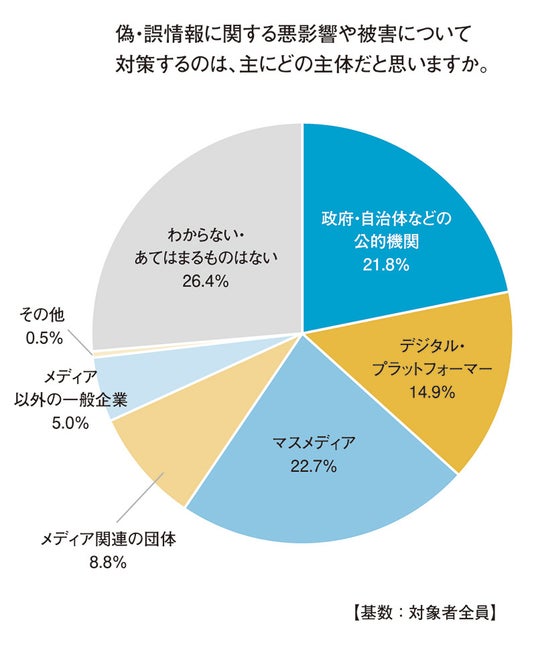 偽・誤情報に関する悪影響や被害への対策を求められる主体としては、「マスメディア(22.7%)」、「政府・自治体などの公的機関(21.8%)」、「デジタル・プラットフォーマー(14.9%)」が挙げられた。