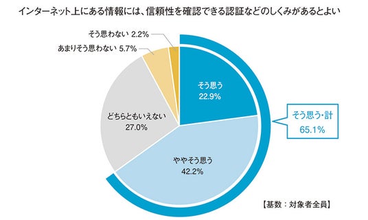 「インターネット上にある情報には、信頼性を確認できる認証などのしくみがあるとよい(「そう思う」「ややそう思う」の計)」との回答は65.1%と過半数を占め、ネット空間における情報の信頼性を担保するしくみへの期待がうかがわれた。