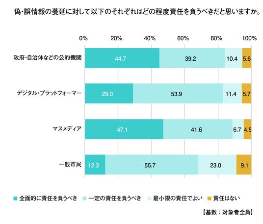 偽・誤情報の蔓延に対して「全面的に責任を負うべき」主体として「マスメディア(47.1%)」、「政府・自治体などの公的機関(44.7%)」が挙げられた。また、「全面的に責任を負うべき」と「一定の責任を負うべき」の計では、「マスメディア(88.7%)」、「政府・自治体などの公的機関(83.9%)」だけでなく、「一般市民(68.0%)」に至るまで、幅広い主体に責任が求められている。