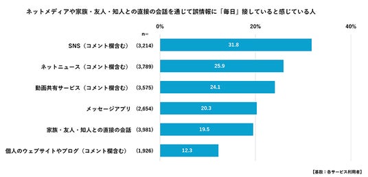 2.誤った情報やニュースを「毎日」見聞きすると感じている人は、SNSで31.8%、ネットニュースで25.9%、動画共有サービスで24.1%