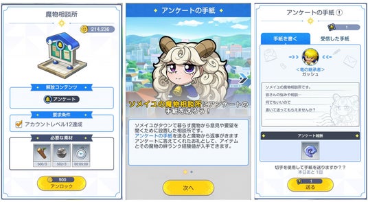 タウン内に新コンテンツ「ソメイユの魔物相談所」が登場します。「ソメイユの魔物相談所」では、魔物を指定し、アイテム「切手」を消費することにより、アンケートの手紙を送ることができます。8時間後に返事を受け取ると、指定した魔物の絆ランク経験値やアイテムを入手できます。