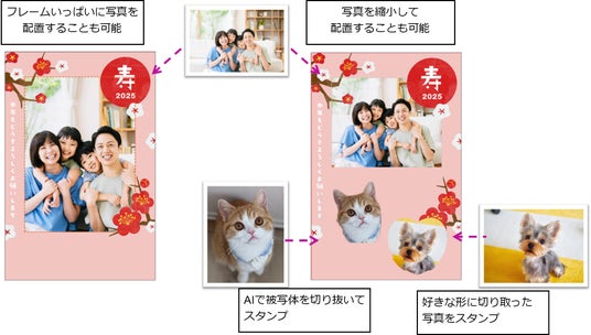 「フジカラーの年賀状 2025」では、想いを込めた年賀状をこだわって作成できるよう、写真のレイアウト機能を拡充。テンプレートのフレーム内であれば、フレームの縦横比にかかわらず、写真を拡大・縮小したり、自由な位置に配置できるため、お気に入りの写真を使った年賀状を作成できます(※3)。また、新機能「写真スタンプ」を使って、好みの形に写真を切り取ったり、AIで写真の背景を消して被写体を切り抜くこと(AI切り抜き(※4))が可能。写真をスタンプ感覚で使って楽しみながらオリジナリティあふれる年賀状を作成できます。