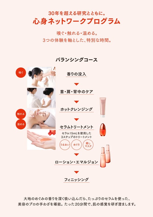 ◆「心身ネットワークプログラム」は、心身ネットワーク研究に基づき、「嗅ぐ・触れる・温める」の3つの体験を軸とした施術プログラムです。「香吸(こきゅう)美容」の自宅ケアと連動した施術内容によって、肌の感覚を研ぎ澄まし、日々のお手入れ効果と美のモチベーションを高めます。