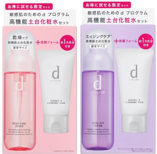 本限定品は、dプログラムの化粧水で最も人気のモイストケア ローション MBと、敏感肌×エイジングケアの両立を叶えるバイタルアクト ローション MBの通常サイズに、それぞれ洗顔料の特製サイズ(約1カ月分※4)が付くセットです。