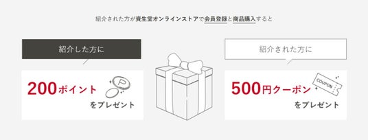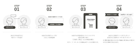 資生堂オンラインストアをご友人などにご紹介いただき、紹介された方が会員登録と商品購入※3 をすると、紹介した方にBeauty Keyポイント「200ポイント」をプレゼントします。