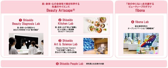 「Shiseido Beauty Park」には、肌・身体・心のつながりを解き明かす先進サイエンス「Beauty Artscape(R)※1」を体験できるラボとして「Shiseido Beauty Diagnosis Lab」、「Shiseido Kitchen Lab」、そして「Shiseido Art & Science Lab」があります。さらに、オープンイノベーションを推進する「fibona Lab」や、すべてのイノベーションを支える研究員の進化を目指す「Shiseido People Lab」があり、5つのラボで構成されています。