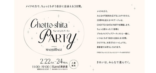 マキアージュ誕生20周年を記念し、「メイクの力で、ちょっとちがう自分に出会える3日間。」をコンセプトとしたイベント「CHOTTO-SHITA PARTY」を、2025年2月22日(土)から3日間にわたり表参道で開催します。