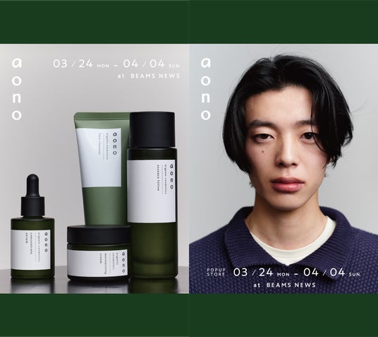 メンズオーガニックコスメブランド「aono(アオノ)」は、2025年3月24日(月)から4月4日(金)の期間限定で、ブランド初となるポップアップストアをJR新宿駅内にある「BEAMS NEWS」にオープンします。ビームススタッフからブランドの特徴やこだわりをご紹介すると共に、オンラインでは体験できない商品の上質な香りやテクスチャを、ビームス監修の店内でご体験いただけます。店内は、aonoのブランドメッセージである「肌に自然の叡智を」をテーマに、オーガニックコスメから連想される自然を随所に表現。都会にいながらも、自然を感じられる空間で、aonoの世界観を五感でお楽しみください。