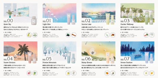 心躍るヘアケアの第一歩となる「シャンプー」1種と、日々変化する自分の気持ちや感性に合わせて選べる、個性豊かな7種の香りの「トリートメント」と「オイル(洗い流さないトリートメント)」をラインナップ。自分らしく自由に、好きな香りを組み合わせて、楽しみながらアイテムを選ぶことができるブランドです。