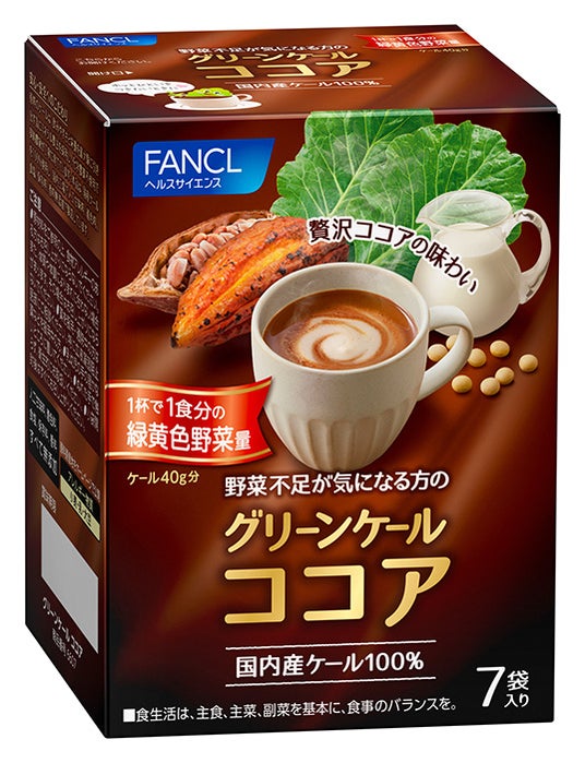 株式会社ファンケルは10月16日(水)から、「グリーンケールココア」(1箱7袋入り/価格:1,080円<税込>)を通信販売と直営店舗にて数量限定で発売します。同製品は、野菜の王様「ケール」を原料とした青汁を温かく、おいしく召し上がっていただける製品です。毎年冬季限定で発売し、ご好評をいただいております。「ケール」と「カカオ」「豆乳パウダー」の三つの素材を使用し、ビターでコク深い大人の味わいに仕上げました。冬の時季の健康維持にお勧めの製品です。