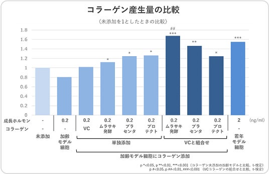 加齢モデルに「VCコラーゲン」、「ムラサキ発酵コラーゲン」、「プラセンタコラーゲン」、「プロテクトコラーゲン」を単独添加した場合、コラーゲン産生量が増加することを確認しました。さらに、「VCコラーゲン」と「ムラサキ発酵コラーゲン」、「プラセンタコラーゲン」、「プロテクトコラーゲン」をそれぞれ組み合わせて添加した場合にも、コラーゲン産生量が増加することを確認し、特に「ムラサキ発酵コラーゲン」との組み合わせでは、若年モデル以上の効果が示されました。