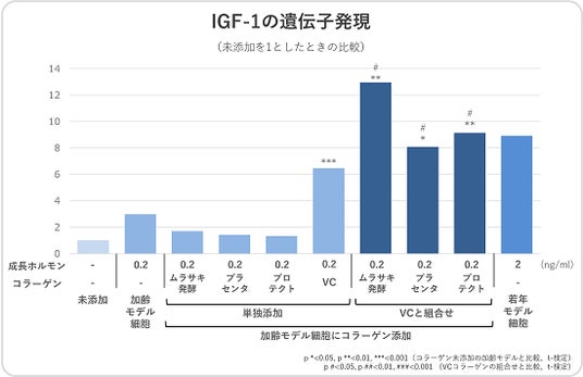 独自コラーゲンの「VCコラーゲン」、「ムラサキ発酵コラーゲン」、「プラセンタコラーゲン」、「プロテクトコラーゲン」を成長ホルモンとともにヒト皮膚線維芽細胞に添加し、IGF-1の作用を検証した結果、IGF-1の遺伝子発現量、IGF-1受容体の遺伝子発現量が増加し、コラーゲン産生を高める効果を確認しました。