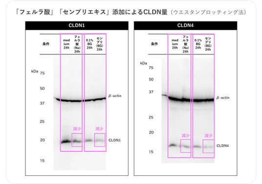分化誘導したNHEKに「フェルラ酸」、「センブリエキス」をそれぞれ添加し、CLDN量を検証した結果、CLDN1※3とCLDN4※4の量が減少することを確認しました。