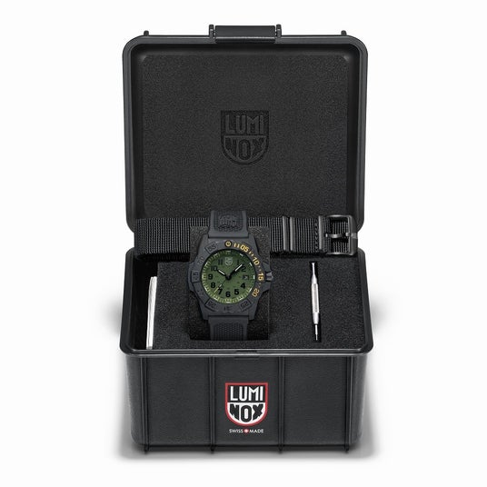 ブラックのラバーストラップに加えて、このセットには冒険と探検用に設計された追加のブラック NATO ウェビングストラップが付属。耐久性があり、軽量で通気性のあるストラップはしっかりとフィットし、軍人やアウトドア愛好家に最適です。ミリタリー風のグリーンとイエローの配色は、LuminoxとNSFの長年にわたるパートナーシップを表現。30年以上もの間、ネイビーシールズは任務中にルミノックスの時計を頼りにしており、このシリーズの最新作もその伝統を受け継いでいます。