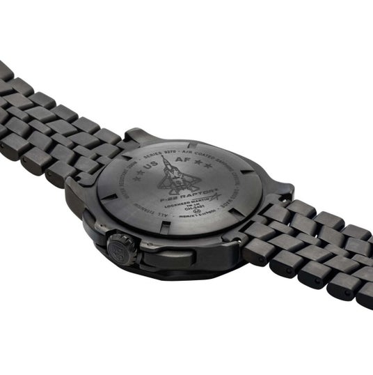 今回のモデルは、ブラックPVD加工されたチタニウムケース・ブレスを採用。F-22の機体メイン素材と同じチタニウム採用により、強度と軽量性双方を備えています。