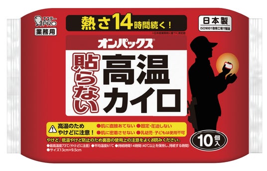 エステー株式会社は、警備、工場、工事現場など寒い中で長時間働く人をサポートする貼るタイプの「オンパックス はる高温カイロ」と貼らないタイプの「オンパックス 貼らない高温カイロ」を10月15日からグループ会社のエステーPRO株式会社の業務用ルートやオフィス向け等のカタログ通信販売ルートを通じて販売します。
