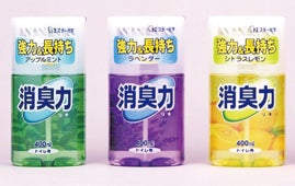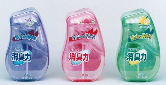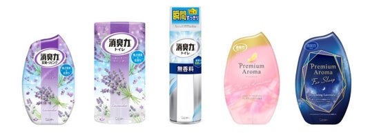 現在の「消臭力」ブランド製品ラインナップ (左から)「消臭力 玄関・リビング用」「消臭力 トイレ用」「消臭力 トイレ用スプレー」「消臭力 Premium Aroma 玄関・リビング用」「消臭力 Premium Aroma For Sleep 寝室用」