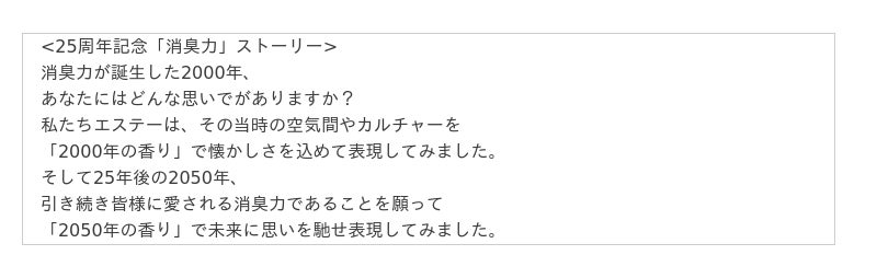 今回発売する25周年記念の「消臭力」は、2000年の発売開始以来25年間のご愛顧に感謝し、これからも愛されるブランドでありたいという願いを込めて、『25周年となる2025年を起点に、過去と未来を繋ぐ』をテーマにしています。香りやデザインを通じて、お客様が過去を懐かしんだり、未来に思いを馳せたりするきっかけになること願い、開発しました。
