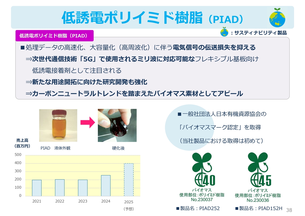 質問者:低誘電ポリイミド樹脂について、2024年度の実績は2億5,000万円程度ですが、前回の資料を見ると、2024年度は4億円の予想でした。これが2025年度の売上高予想となり、目標が1年延びていますが、この背景を教えてください。