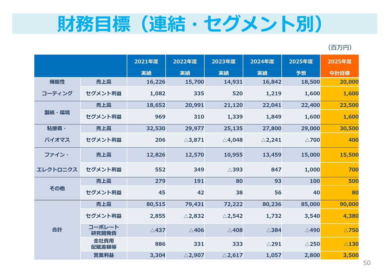 ファイン・エレクトロニクス事業など、生成AIで非常に伸びる分野も一部ありますが、製紙事業や粘接着事業などはそこまで大きな伸びが期待できるところではないため、着実にキャッシュを稼ぎ、収益性を向上させていきます。