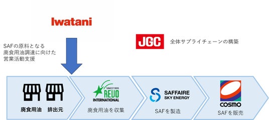 岩谷産業は、SAFFAIRE SKY ENERGYからの業務委託を受け、岩谷産業が持つ全国約330万世帯のLPガス顧客網や、産業ガス・エネルギー事業のネットワークを活用して、国内廃食用油の排出元を開拓し、国産SAFの原料としての調達に協力いたします。レボインターナショナルは、岩谷産業が開拓した排出元から廃食用油を収集し、SAFFAIRE SKY ENERGYが大阪府堺市で推進する日本初となる国産 SAF の大規模生産プラント(2024年12月完工)向けに納入いたします。さらに、SAFFAIRE SKY ENERGYは国内唯一となる国産 SAF の大規模製造設備において、レボインターナショナルから納入された廃食用油を原料としてSAFの製造を行います。