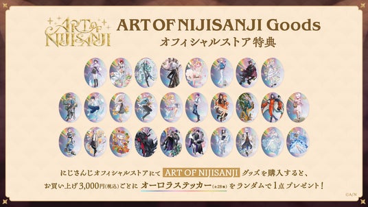 にじさんじオフィシャルストアにて「ART OF NIJISANJI」グッズを購入すると、お買い上げ3,000円(税込)ごとに「オーロラステッカー(全28種)」をランダムで1点プレゼント!