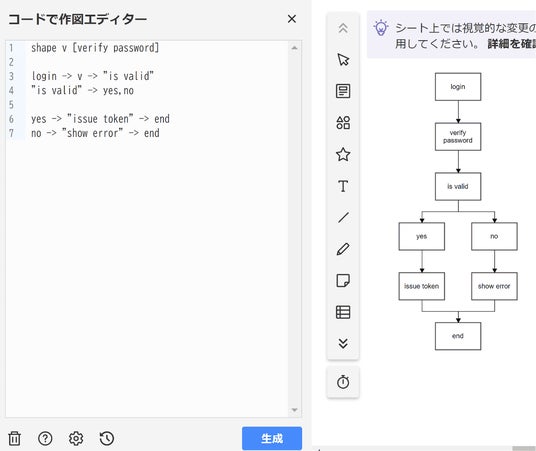 機能の詳細は、Cacooブログ「複雑な分岐図もきれいに作図!「コードで作図」機能をリリースしました」をご覧ください。