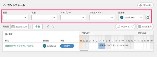 「種別」「カテゴリー」「マイルストーン」「担当者」でも課題を絞り込めるように