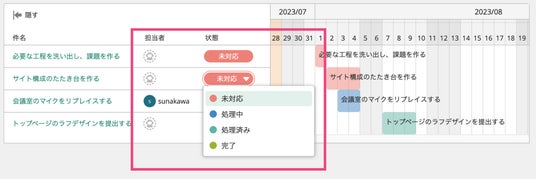担当者、状態の変更をガントチャート上から更新可能に