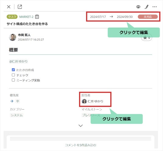 新機能を使用することにより、会議でガントチャートを確認しながら課題の状態や期限を更新、またコメントの追加もでき、よりスムーズにチームワークマネジメント*を行うことが可能です。