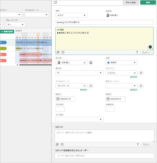 今回追加した編集モードでは、これまでサイドパネルで編集が可能だった課題の「状態」「開始・期限日」「担当者の変更」「コメント追加」に加え、「種別」「課題の詳細」「カテゴリー」といったより詳細な情報も変更することができるようになります。引き続き既存の課題編集ダイアログも表示可能ですが、ガントチャートの全体像から遷移せず、スムーズに課題を更新できるため、プロジェクト・タスク管理の効率が向上します。