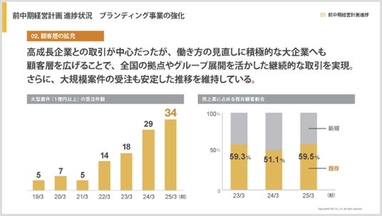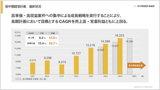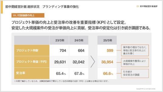 前中期経営計画における財務目標の1年前倒しでの達成は、安定した大規模案件の受注によるプロジェクト単価の向上、および受注率の改善を戦略的に推進した結果によるものです。現在、当社は案件数の増加ではなく、単価向上と受注率の強化に重点を置いた経営戦略を展開しており、特に大規模案件の獲得を通じて収益基盤の強化を図っています。この取り組みにより、より安定した業績成長を実現し、持続的な企業価値向上につなげることができました。