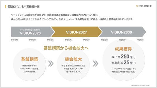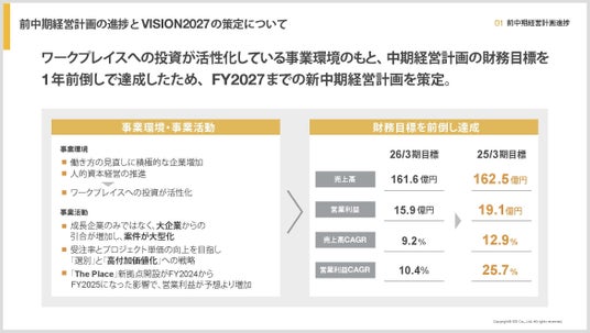 当社は、2023年5月に策定いたしました2024年3月期から2026年3月期を対象とする中期経営計画において、オフィスという空間のみをデザインすることから、「はたらく」こと全体の課題を解決し、社会に新しい価値を提供してまいりました。その結果、2026年3月期の財務目標である連結売上高16,169百万円および連結営業利益1,597百万円を1年前倒しで達成いたしました。これを受けて、2026年3月期より3年間(2026年3月期から2028年3月期)を対象とした新中期経営計画を策定することといたしました。