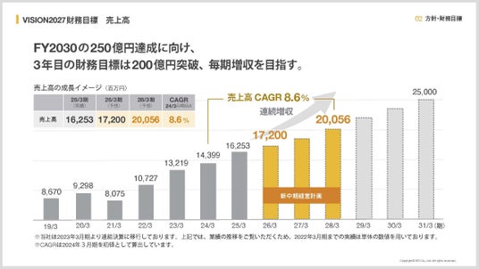 FY2027(2028年3月期)の財務目標は連結売上高200億円突破、毎期増収を目指していきます。