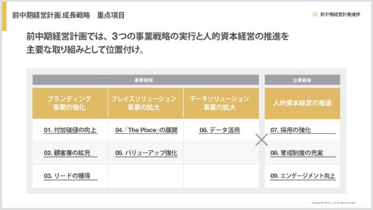 ブランディングの成長、データソリューション・プレイスソリューションの成長、多様化・外部成長、経営戦略・基盤強化の4つの面から、それぞれの戦略を通じて、さらなるシナジーを創出し機会拡大を促進することで、今後も成長を続けてまいります。